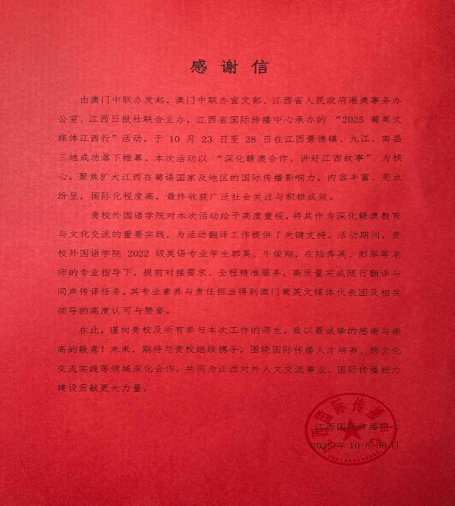 2025年10月23日至28日,由澳门中联办发起,澳门中联办宣文部、江西省人民政府港澳事务办公室、江西日报社联合主办,江西省国际传播中心承办的 “2025 葡英文媒体江西行”活动在江西景德镇、九江、南昌三地成功举办。活动围绕 “深化赣澳合作、讲好江西故事”,内容多样,受到广泛社会关注,扩大了江西在葡语国家及地区的国际传播影响。活动期间,澳门六合彩资料库