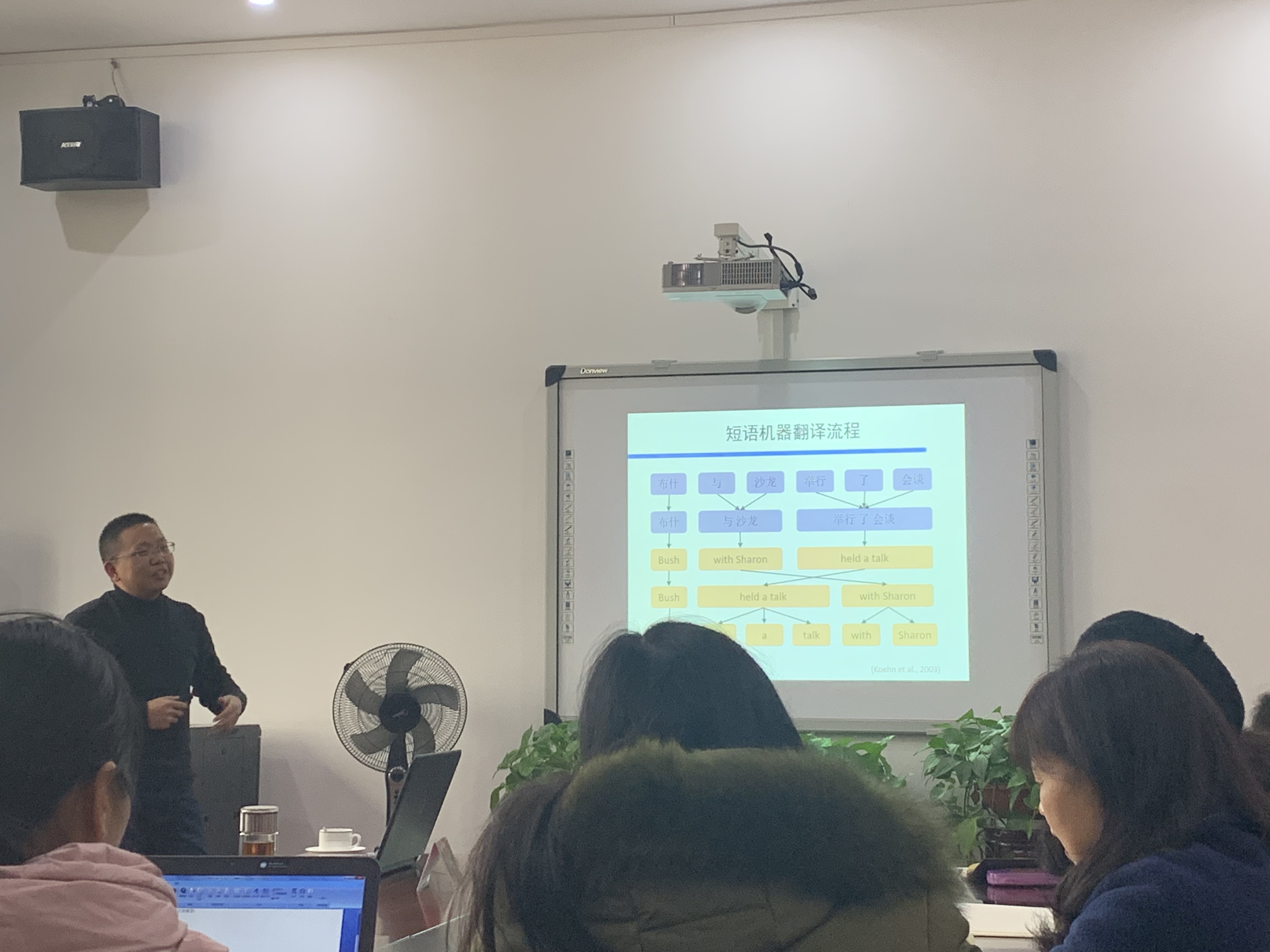 接着,邬昌兴博士做了题为“机器翻译浅谈”的讲座。邬博士围绕短语机器翻译、神经网络机器翻译、面临的挑战三方面展开论述,介绍了机器翻译的历史,短语机器翻译流程,需要的数据分析,总结了机器翻译的优点与缺点,并就机器翻译面临的挑战做进一步解释。机器翻译存在漏译问题,语篇翻译欠缺,缺乏背景知识和语言学知识的融入,机器翻译数据稀疏。与会人员对机器翻译与人工翻译未来发展展开讨论。