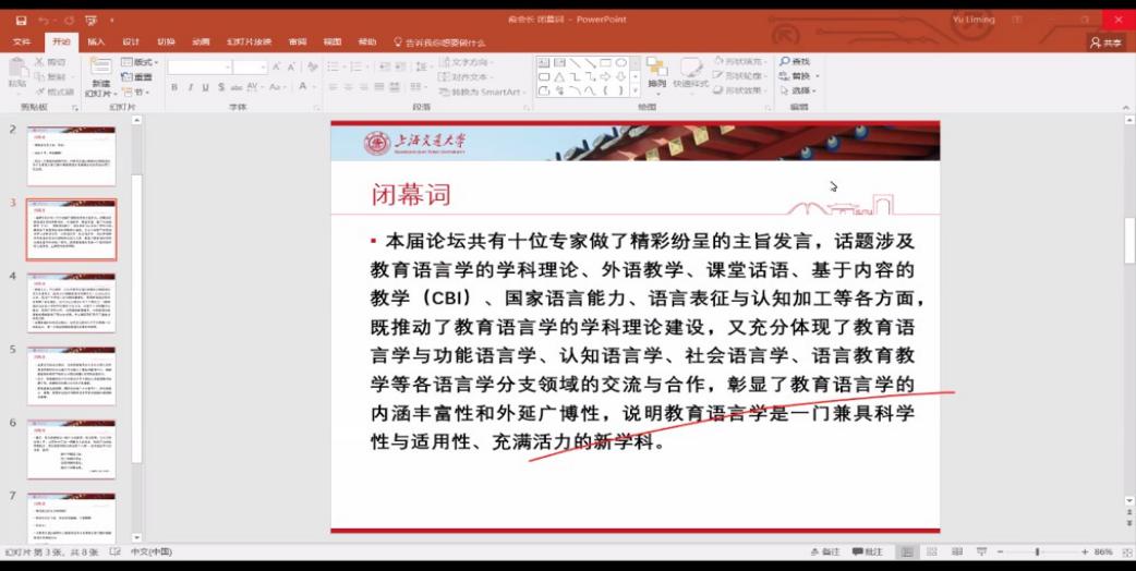 交通与工程应用翻译研究中心承办的“第五届中国教育语言学高端论坛(云端会议)”成功召开。会议由中国英汉语比较研究会教育语言学专业委员会主办、华东师范大学出版社和蓝鸽集团协办。来自国内高校200多名专家、学者、老师和同学汇聚云端,围绕会议主题——“语言的社会功能与教育教学”进行了广泛深入的交流。此次高端论坛得到澳门六合彩资料库